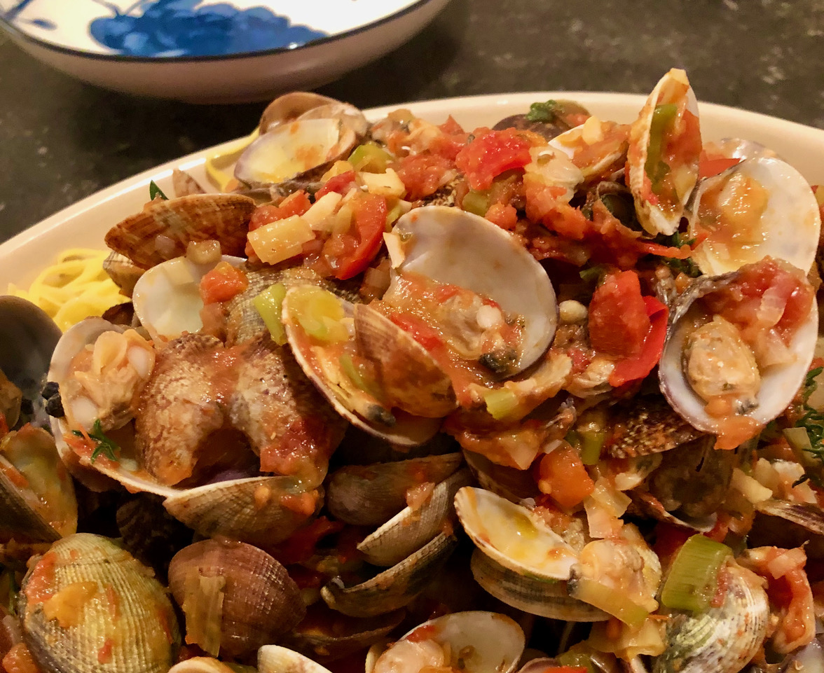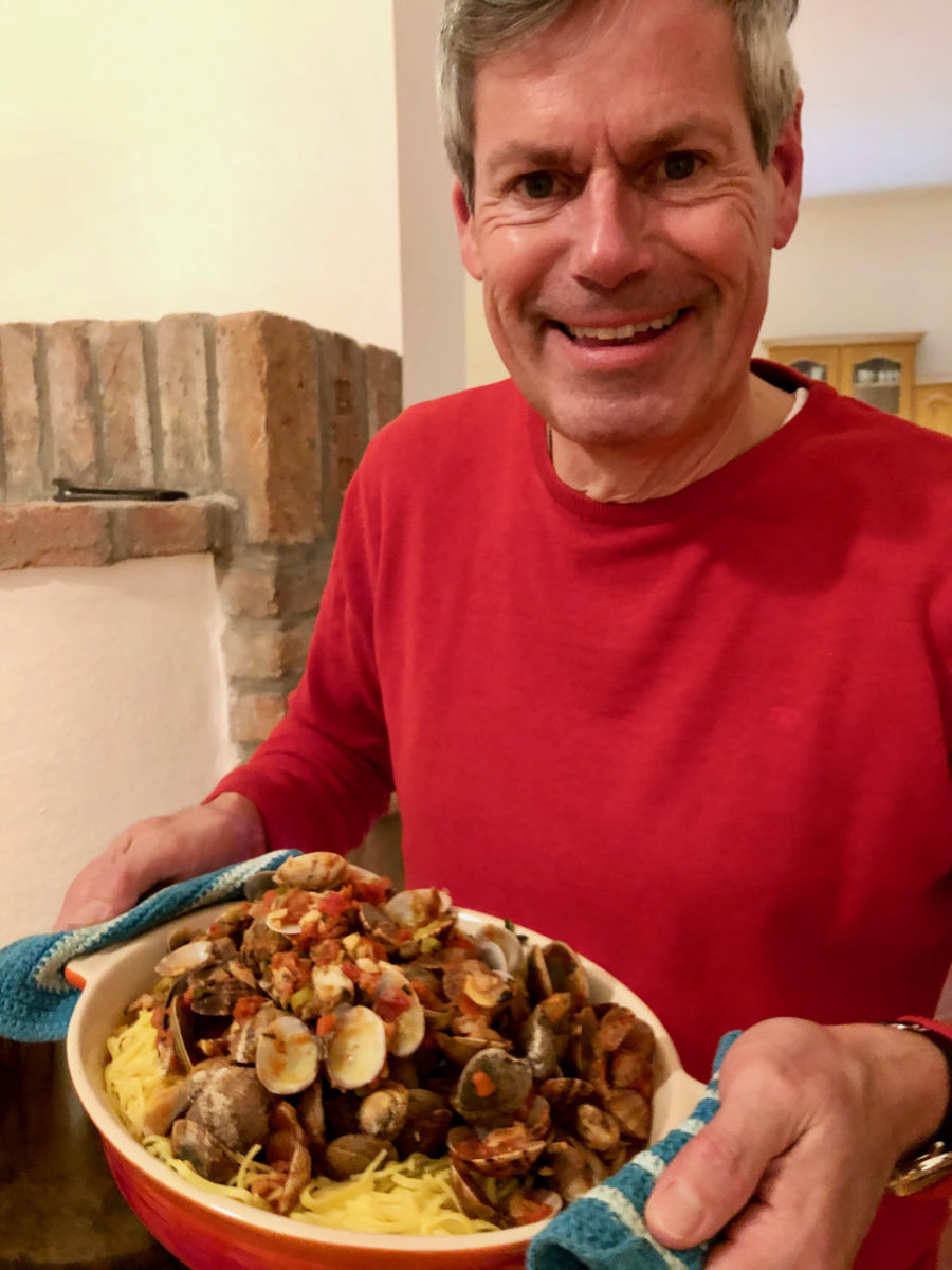 Wenn wir schon nicht ans Meer kommen, dann kommt das Meer eben zu uns. Dachten wir uns und stelltne einen Sud Venusmuscheln zu, die wir mit den unglaublichen Nudeln von Marco Giacosa aus dem Piemont serviert habe.