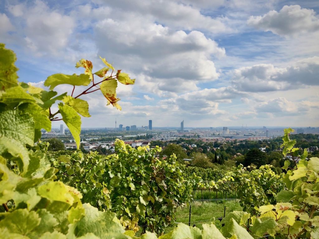 Ein paar Trauben muss ich trotzdem naschen. Prall und süß und gut sind sie und vor meinem geistigen Auge sehe ich, wie es weitergeht. Sturm, Weintaufen, rote Wangen, fröhliches Lachen, Ganslessen, gemütliches Beisammensein. Der Wein erfreue des Menschen Herz… das wird er auch. Vor mit tut sich das Panorama der Stadt Wien auf und einmal mehr wird mir bewusst, was für etwas Besonderes der Weinbau in dieser Stadt ist und wie notwendig es ist, ihn zu schützen und zu bewahren. Und wenn schon sonst durch nix, dann wenigstens, indem man den Wiener Winzern als Konsument zur Seite steht. Ein paar spektakuläre Ausblicke später bin ich auch schon oben und konstatiere, dass nicht alles immer nur schlechter wird. Denn während man früher hier oben verdurstet ist, wenn der Sirbu nicht gerade ausg’steckt hatte. haben heute die Weingüter Wieninger, Mayer am Pfarrplatz und Wailand in äußerst einladender Weise ihre Heurigenbänke, Liegen und Lounge-Chairs aufgestellt. So tragen sie der Tatsache Rechnung, dass der Wein immer noch dort am besten schmeckt, wo die Trauben gewachsen sind.