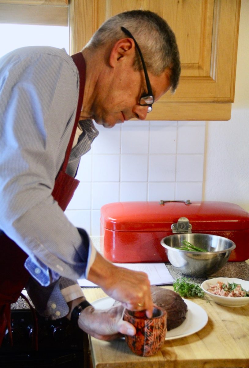 - Den Speck mit dem Majoran vermengen und das Fleisch damit einreiben.