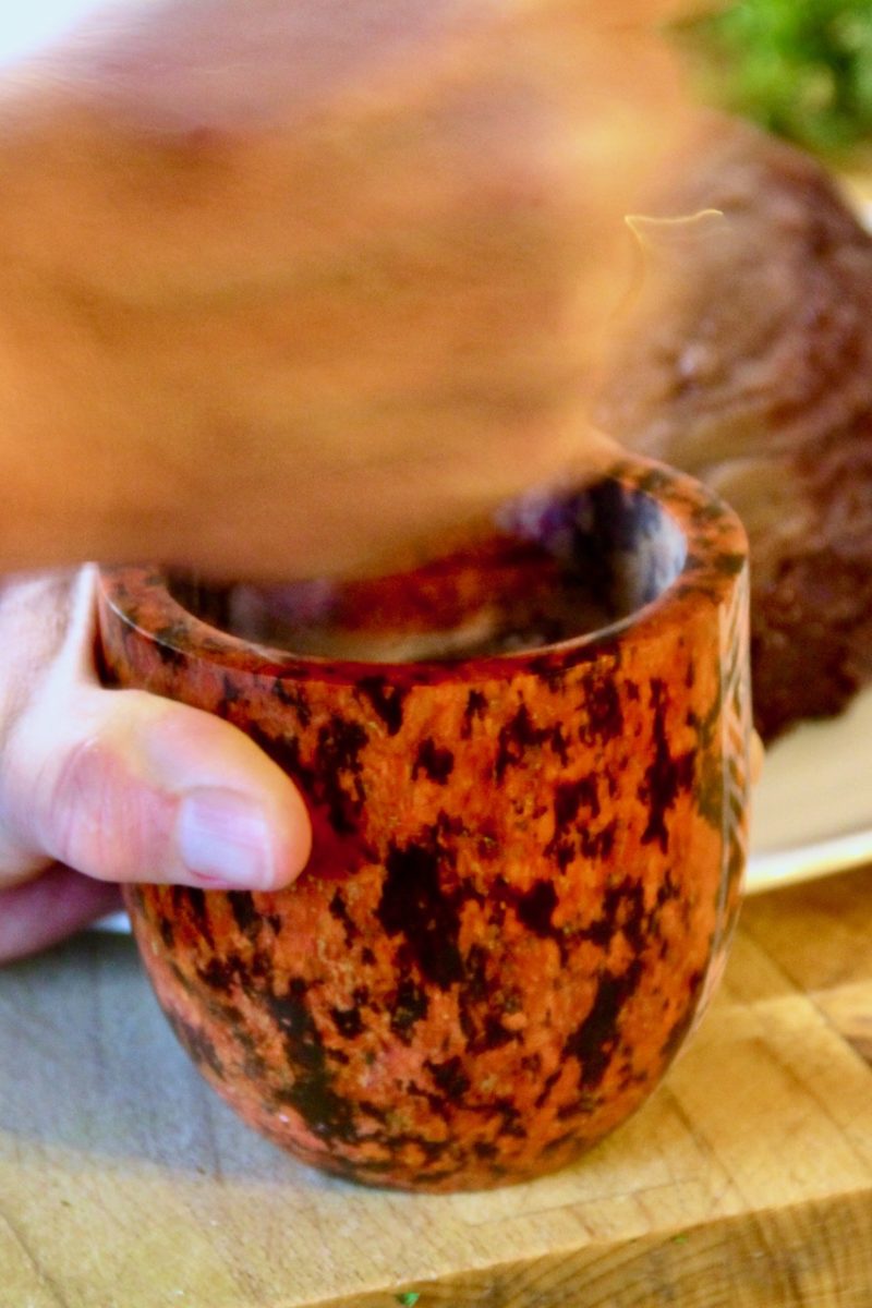 Unser Rindsbraten hatte es gut: Gemäß Rezept durfte er sich erst eine Nacht und einen Tag in einem feinen burgenländischen Rotwein suhlen, ehe es für ihn ab ins Backrohr ging. Und auch dort wurde ihm nicht höllisch eingeheizt: Mit 140 Grad ging es rund dreieinhalb Stunden der Vollendung entgegen und das zahlte sich auch aus. Wie heißt es so schön: In der Ruhe liegt die Kraft! Und so fanden denn auch unsere zwei – in gut dosierter Corona-Distanz sitzenden – Gäste, dass der Braten butterzart und daher bestens gelungen war. Wie wir dann erfuhren, haben sie mit Rindsbraten schon so ihre Erfahrungen gemacht: Zäh, grobfaserig, trocken. Das konnte man unserem Braten jedenfalls nicht vorwerfen: Denn der war mürbe und hatte trotzdem noch einen Biss.