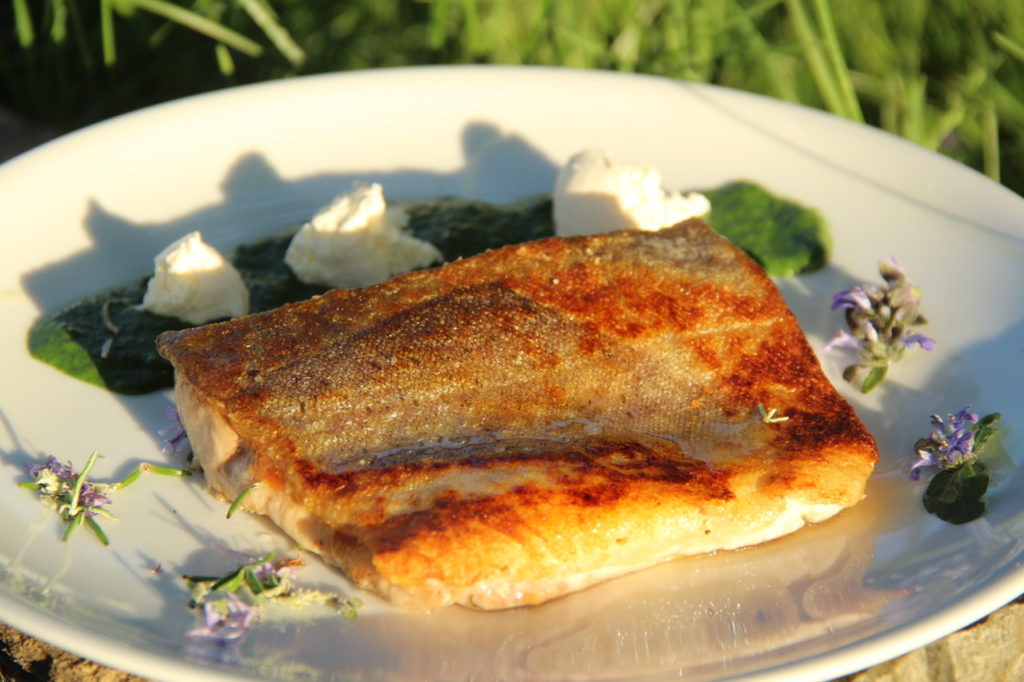 Das Huchenfilet in Rapsöl kurz anbraten und zusammen mit kleinen Stücken vom Schaftopfen samt dem Brennesselspinat anrichten.