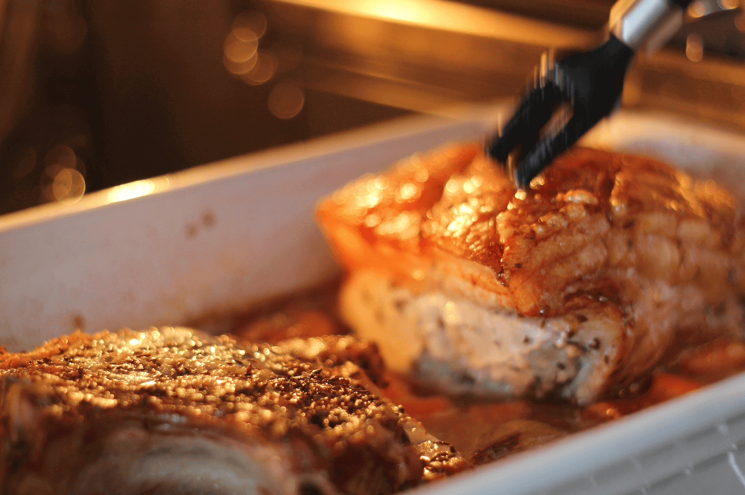 - Dann das Backrohr auf ca. 190 °C vorheizen. Eine passende Bratenform (Rein) bodenbedeckt mit Wasser füllen, Schmalz zugeben und alles erhitzen. Braten mit der Schwarte nach unten einlegen, ins vorgeheizte Backrohr schieben und vorerst 20 Minuten braten. Wenden und die Schwarte mit einem scharfen Messer in regelmäßigen Abständen der Länge und der Breite nach ein-, aber nicht bis zum Fleisch durchschneiden. Je nach Größe ca. weitere 1 ½ Stunden (oder länger) fertig braten. Währenddessen in einer Tasse etwas Bier mit Salz würzen und die Kruste damit wiederholt bestreichen und bei Bedarf frische, warme Suppe (oder Wasser) zugießen, damit der Braten nicht trocken wird. (Dabei nie zu viel Flüssigkeit zugießen, damit die Sauce eine schöne Farbe bekommt.) Nach etwa 1 Stunde auch den Knoblauch zugeben und mitbraten.