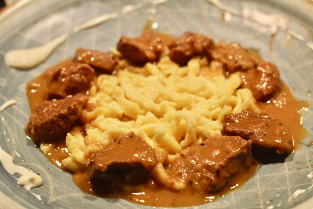 Rotwein in der Soße verlangt nach Rotwein im Glas – so weit, so einfach. Doch dann kommt die Feinarbeit. Das Gericht selbst ist sehr sämig und mollig – da darf es der begleitende Wein eher nicht sein. Also kein breiter, üppiger Typ mit viel Holz und Süße, sondern eher strukturiert und animierend. Nicht ganz jung, damit sich die ersten Kanten schon abgeschliffen haben aber auch kein Methusalem, der vor der dichten Aromatik des Kalbsrahmgulasch gleich in die Knie geht. Entschieden habe ich mich schließlich für einen Leithaberg DAC 2012 vom Weingut Nehrer in Eisenstadt. Ein Blaufränkisch, der die feine Klinge führt, gerade noch jugendlich genug um mit seinen dunkelfruchtigen Aromen auch etwas Frische in diese Kombination zu bringen aber auch knackig-mineralisch und mit ganz schönem Druck am Gaumen. Das Ergebnis war absolut zufriedenstellend, der Wein hielt schön dagegen, wirkte animierend und brachte mit seiner eleganten Gerbstoffstruktur die nötige Spannung in dieses Duett.