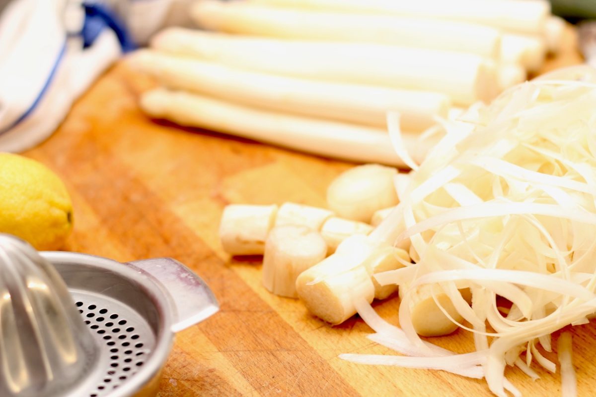 Das letzte Drittel der Spargelstangen zu Ringen schneiden und als Einlage für das Risotto beiseite stellen.