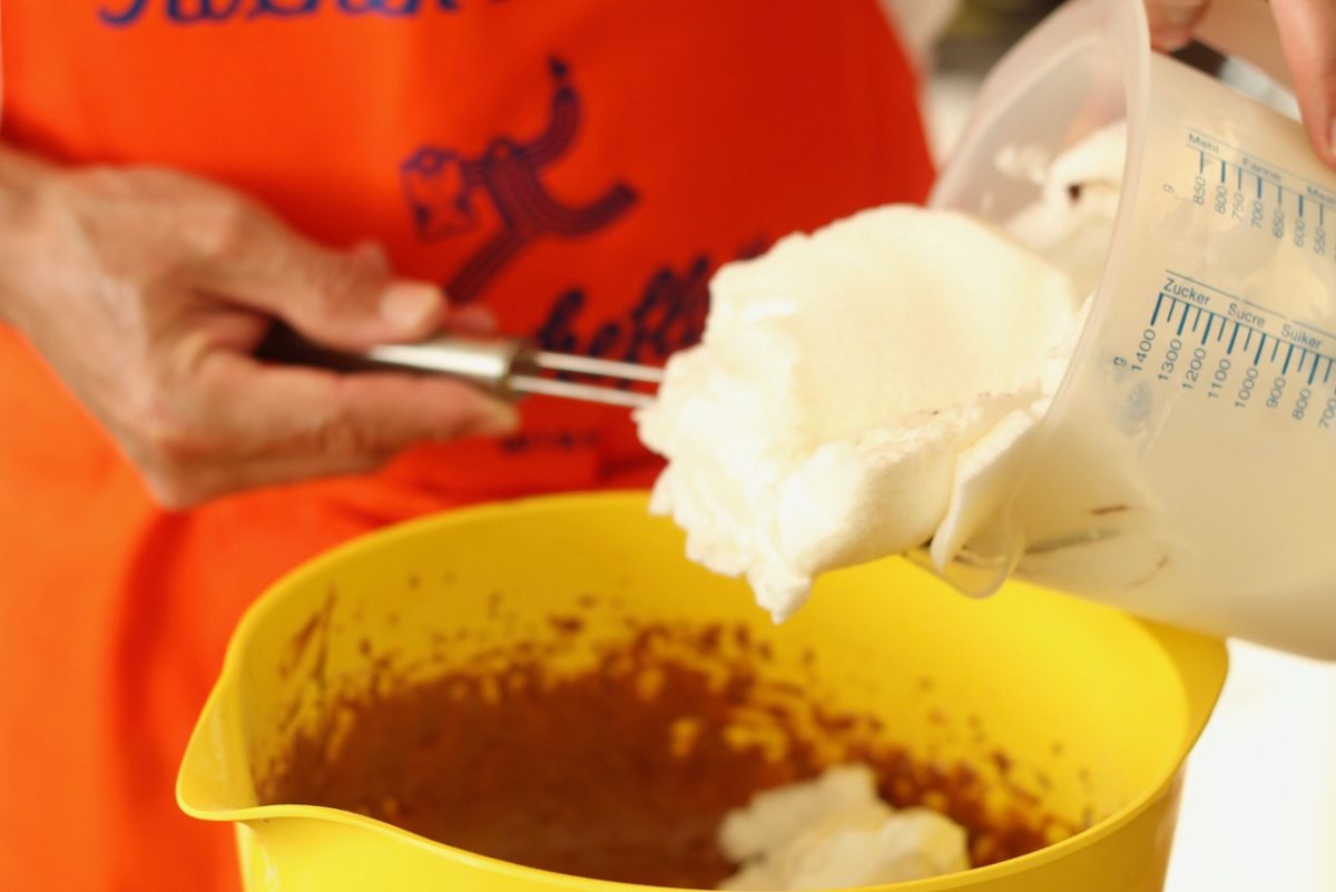 Nun den Eischnee und die Nussmischung in den Abtrieb unterheben.