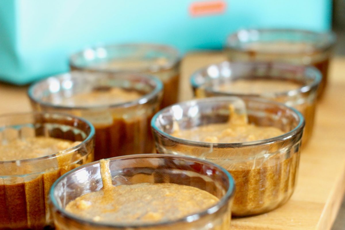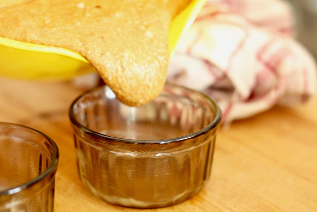 Dariolformen mit Trennfett oder Butter gut einfetten, Formen zu 2/3 mit der Masse füllen, ins Wasserbad stellen und bei niedriger Temperatur, 170 Grad Ober- und Unterhitze im Backofen, zugedeckt (z.B. mit Klarsichtsfolie) ca. 30-35 Minuten pochieren.