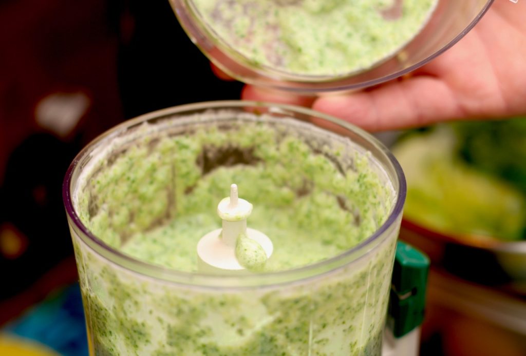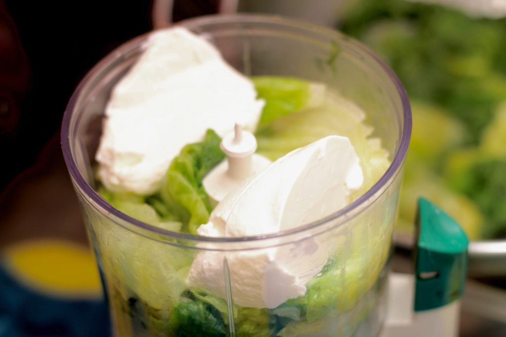Den Kopfsalat in kochendem Wasser kurz blanchieren, dann im kalten Wasser abschrecken und mit dem Sauerrahm in der Moulinette zu einer feinen Paste mixen. Kalt stellen.