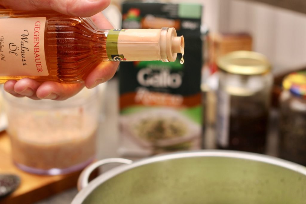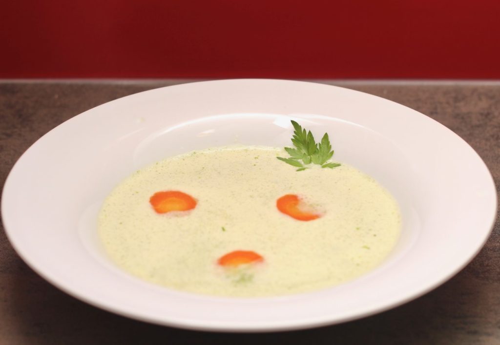 Die Räuchersuppe aufkochen, etwas flüssiges Obers zugeben und einen Teil der Kopfsalatpaste zugeben. Mit ein paar Tropfen Nussöl verfeinern, alles gut durchmixen und servieren.