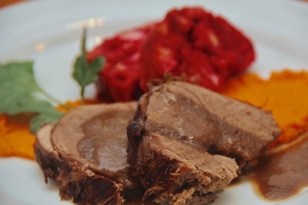 Geschmorter Rehschlögel mit Rote Beete Knödel, Karottenpüree & Zwiebeln