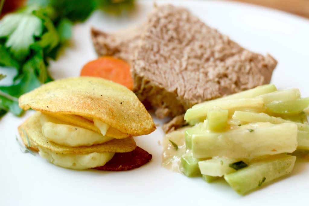 Das Rezept für den neuesten Beitrag zu unserem Foodblog „Klostertaler Kalbstafelspitz im Heusud“ , das uns der Küchenchef der Traube in Braz im Vorarlberger Klostertal, Herwig Pacher, zur Verfügung gestellt hat, versprach für uns Vorarlberger auch gleich ein Stück Heimat-Geschmack. Doch was im Klostertal gleich hinter dem Haus wächst, wirft mitten in Wien gleich ein kleines Beschaffungsproblem auf… denn die Heuproduktion in der Bundeshauptstadt hält sich bekanntlich in sehr überschaubaren Grenzen. Die Lösung fanden wir schließlich in der Tierhandlung – feinstes Wiesenheu, eigentlich für’s Hauskaninchen gedacht aber auch für unseren Sud perfekt geeignet. A propos Sud: Der mundete so köstlich, dass er, als Suppe serviert, bei unseren zahlreichen Gästen dem eigentlichen Hauptgericht beinahe den Rang abgelaufen hätte. Und noch eine Erfahrung, die wir Ihnen, liebe Küchenmeisterinnen und Meister gerne weitergeben möchten: Wir hatten zwei Stücke vom Kalbstafelspitz, eines mit etwa 800 Gramm, eines mit 1,2 Kilo – ersteres war nach eineinhalb Stunden locker gar, das andere brauchte auch nicht viel länger – also wenn die Beilagen vielleicht noch nicht parat sind, sollte man die guten Stücke besser aus der Suppe ziehen und warmstellen als sie endlos zu verkochen.