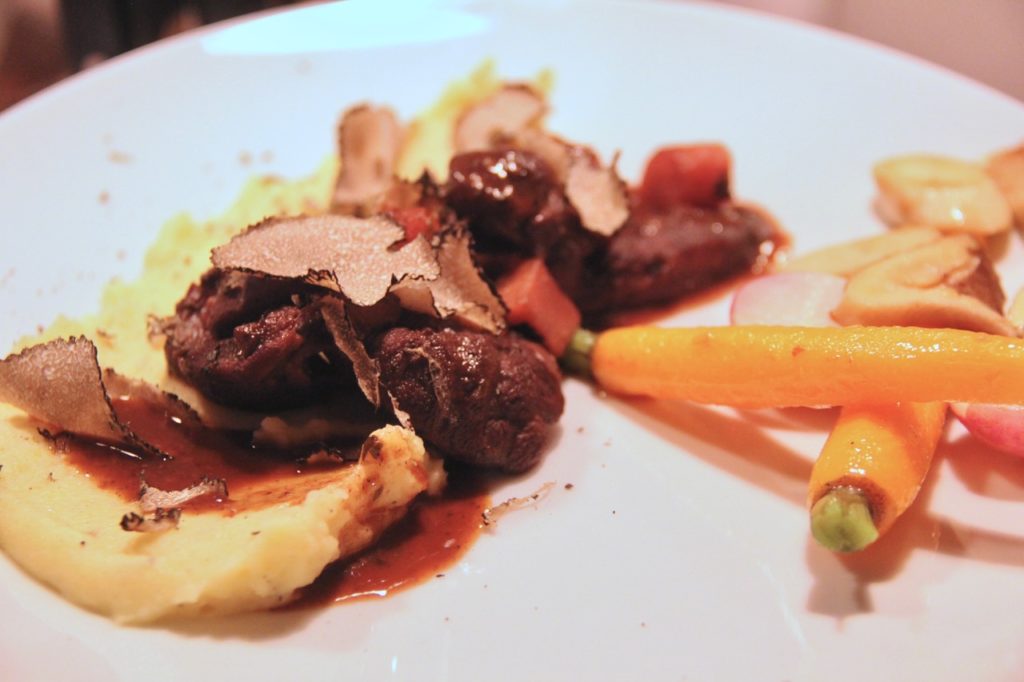 Osso Osso bucco? Kennen und lieben wir! Aber Osso bucco vom Reh? Das war für uns neu und darum gleich doppelt interessant. Das Rezept dazu stammt vom Landhotel Seppenbauer der Familie Schwegersbauer im kärntnerischen St. Salvator, umgesetzt wird es von Küchenchef Manuel Pirker. Und das hat es ganz schön in sich, ist nichts, das man schnell im Vorbeigehen kocht. Erst einmal einen schönen Wildfond aufgesetzt – und damit ist die Sache schon ein 2-Tages-Projekt. Dann kommt gediegenes Handwerk, das am Ende zu einer wunderbar dichten, stoffigen Wildsauce führt. Flankiert wird sie von einem noblen Trüffel-Erdäpfel-Pürree und Gemüse, dem im Idealfall Steinpilze das Tüpfelchen auf das i setzen. Wir haben am Wiener Naschmarkt keine bekommen und uns mit Kräuterseitlingen getröstet – am Ende eine verschmerzbare Abweichung vom Original!