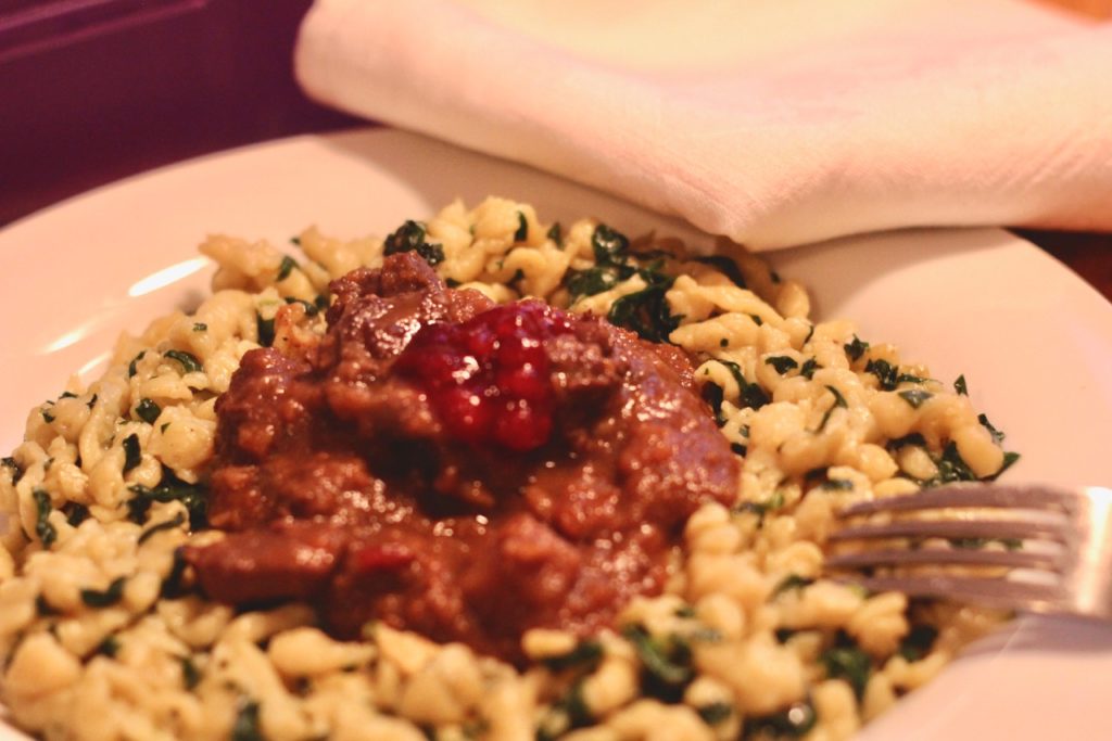 Patron Roland Krammer von der Gastwirtschaft Neunläuf im Weinviertler Hobersdorf unterhält beste Beziehungen zur örtlichen Jägerschaft. Das schlägt sich in Produkten wie hausgemachtem Wildschinken und Wildsalami ebenso nieder wie in der Küche des Hauses, wo Wild während der Saison eine zentrale Rolle spielt. Mit seinem Rezept für ein Rehgulasch mit Bärlauchspätzle zeigt uns Krammer, dass auch die weniger „wertvollen“ Teile des Rehs so ihre Schokoladenseiten haben – in die Sauce für das Gulasch kommt nämlich neben den klassischen Zutaten auch Bitterschokolade, was seinen Geschmack perfekt abrundet.