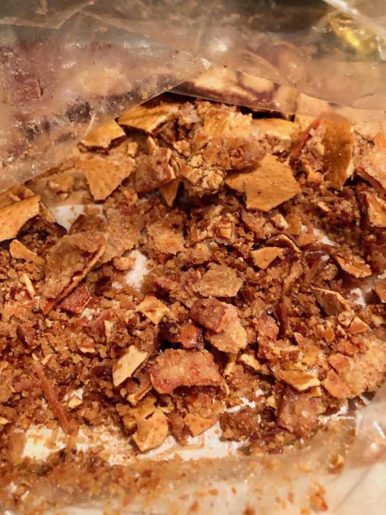 Die überkühlte Schwarte in einen Gefrierbeutel geben, an der offenen Seite mit der Hand verschließen und mit einem Schnitzelklopfer zu feinen Grammeln zerschlagen.