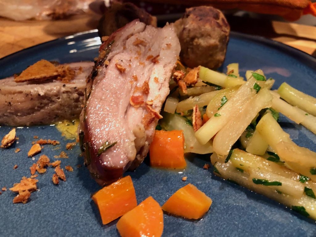 Ein schönes Gericht für warme Tage und am Ende eigentlich leichter, als es klingt, denn vom Fett des Schweinebauchs bleibt nach dem Garen gerade so viel übrig, dass er nicht nur mürbe, sondern auch schön saftig ist. Und die Kohlrabi stammten jahreszeitlich bedingt zwar nicht aus dem Hausgarten sondern aus Italien, waren aber so süß und saftig, dass wir dabei gar kein schlechtes Gewissen haben konnten.