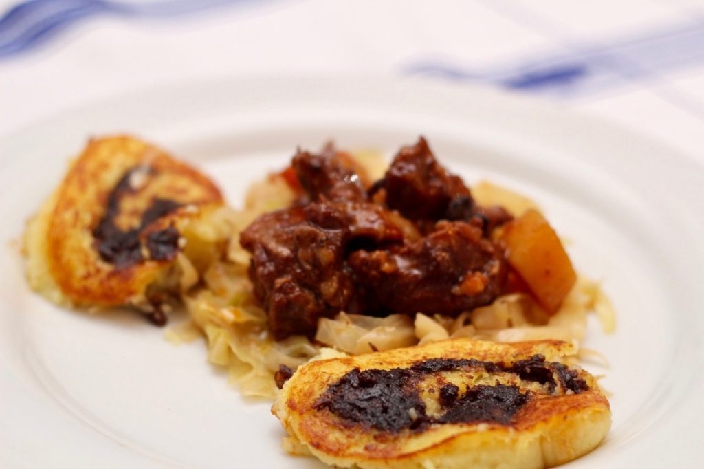 Gekocht wird hier grundsätzlich bodenständig aber mit einem gewissen Twist, der auch die traditionelle Waldviertler Küche zu etwas Besonderem macht. Dazu gibt es feine Weine, die man sich gerne auch selbst im alten Gewölbekeller aussuchen kann und „Hirschs Delikatessen“, Hausgemachtes im Glas zum Mitnehmen. Wir haben festgestellt, dass wir eigentlich zwei Essen gekocht haben, denn allein die Erdäpfel-Blunz’nroulade mit dem Weinkraut wäre ein Gericht für sich aber mit den geschmorten Schweinsbackerln wird die Sache natürlich richtig rund und nochmals besser.