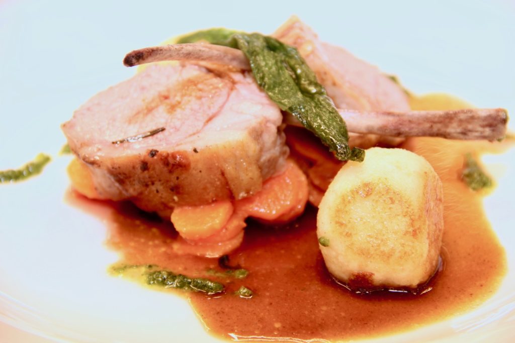 Rücken vom Mattigtaler Lamm mit Gärlauch-Karotten und gebratenen Topfenknöderln