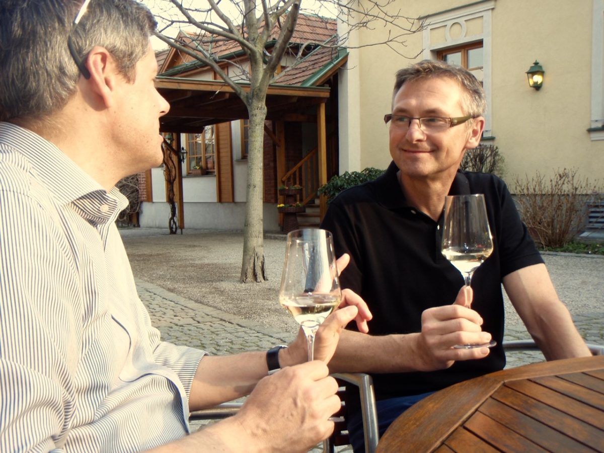 Beim Wein treffen sich Winzer und Weinjournalisten: Vinaria-Chefredakteur Peter Schleimer, Weinpblizist Peter Weirather, Andi Kollwentz, Willi Bründlmayer. Brigitta und Karl Steininger.