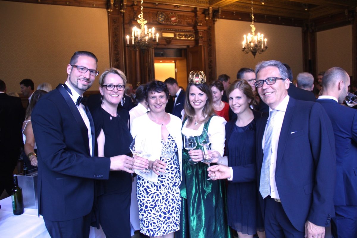 Den burgenländischen Wein hochleben lassen: v.l. Wirtshausführer Herausgeber Klaus Egle, Wein-Burgenland-Geschäftsführer Christian Zechmeister, Präsident des burgenländischen Weinbauverbandes Andreas Liegenfeld, Weinkönigin Anna I., Daniel und Lotte Adrian, Landesrätin Verena Dunst und Wein-Burgenland Obmann Matthias Siess.