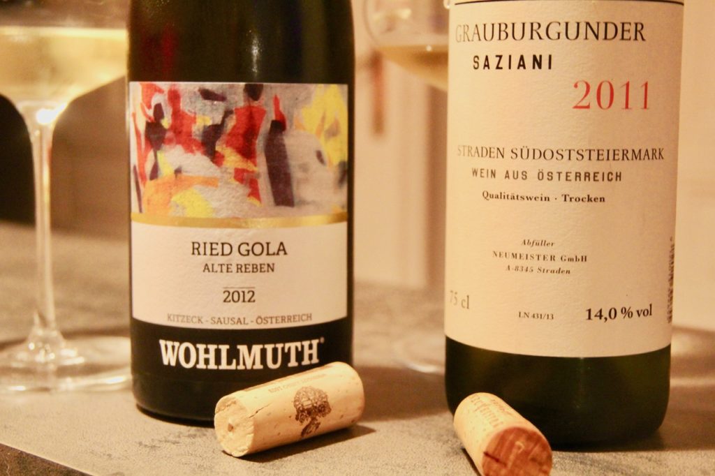 Das Schicksal wollte es, dass mir gleich zwei Weine in die Hände fielen, die dafür in Frage kommen würden und, das sei gleich vorweggenommen, beide haben mich überzeugt. Der reinsortige Grauburgunder Saziani 2011 vom Weingut Neumeister in Straden mit seinem nussigen Duft, der die anheimelnde Wärme von getrockneten Feigen und Bratäpfeln verströmt und seinem fokussierten Körper, der zugleich weiche Kanten zeigt; mit Luft im Glas wurde er zunehmend mineralischer und geradliniger, blieb dabei aber seinem cremig-angenehmen Charakter, der auch von perfekter Reife zeugt, treu. Ganz anders der Ried Gola 2012 vom Weingut Wohlmuth in Fresing bei Kitzeck, eine Cuvée aus Chardonnay, Pinot Gris und Pinot Blanc von uralten Rebstöcken. Der Wein wirkt im Duft noch recht verschlossen und vor allem sehr jugendlich.
