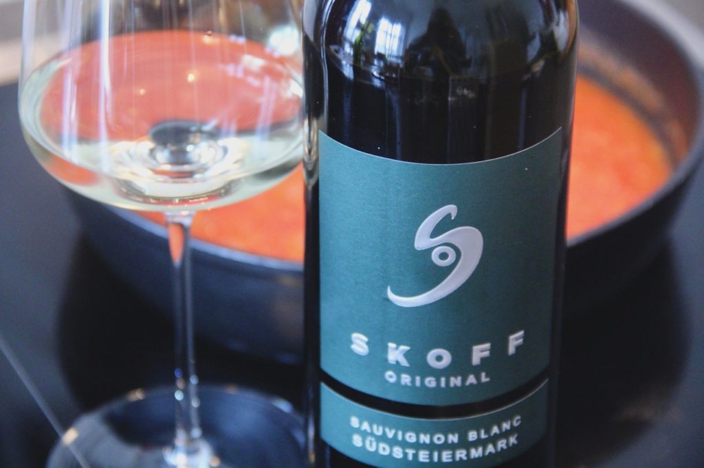 Malvasia, Tokai friulano & Co hätten hier natürlich auch gut gepasst, waren aber gerade nicht bei der Hand. Also war mein spontaner Gedanke: Sauvignon Blanc. Nicht zu kräftig, kein Holz, eine ganz klassische Geschichte sollte es zur Sepialazanje sein. Fündig wurde ich bei einem wahren Meister des Sauvignons – es gibt wohl keine Spiel- und Ausbauart dieser Rebsorte, die Walter Skoff nicht perfekt beherrscht. Der Sauvignon Blanc Südsteiermark 2016 vom Weingut Skoff Original erwies sich denn auch als guter Griff und vor allem sehr feiner Speisenbegleiter: Gar nicht laut in der Nase entwickelte er am Gaumen eine sehr typische Sorten-Aromatik nach schwarzen Ribiseln gestützt von einem lebendigen Spiel der reifen Säure, die dem Gericht eine angenehme Frische verlieh, was in Summe dazu führte, dass wir die vier bis fünf zubereiteten Portionen locker zu dritt aufgegessen haben.