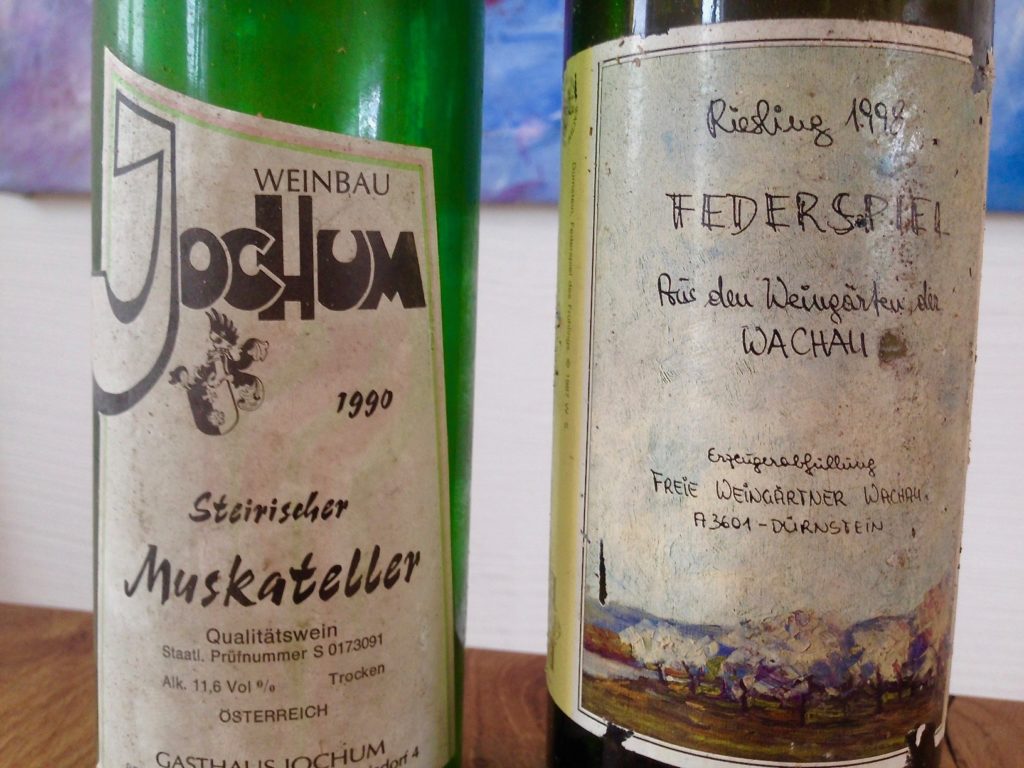 Zwei Wein-Fundstücke aus einem alten Keller in der Nachbarschaft. Ausgegraben von einer Freundin und einfach so zum Spaß mitgebracht, mit der Frage: Kann man das noch trinken? „Kaum“, urteilte ich als Experte und holte schon mal den Korkenzieher…