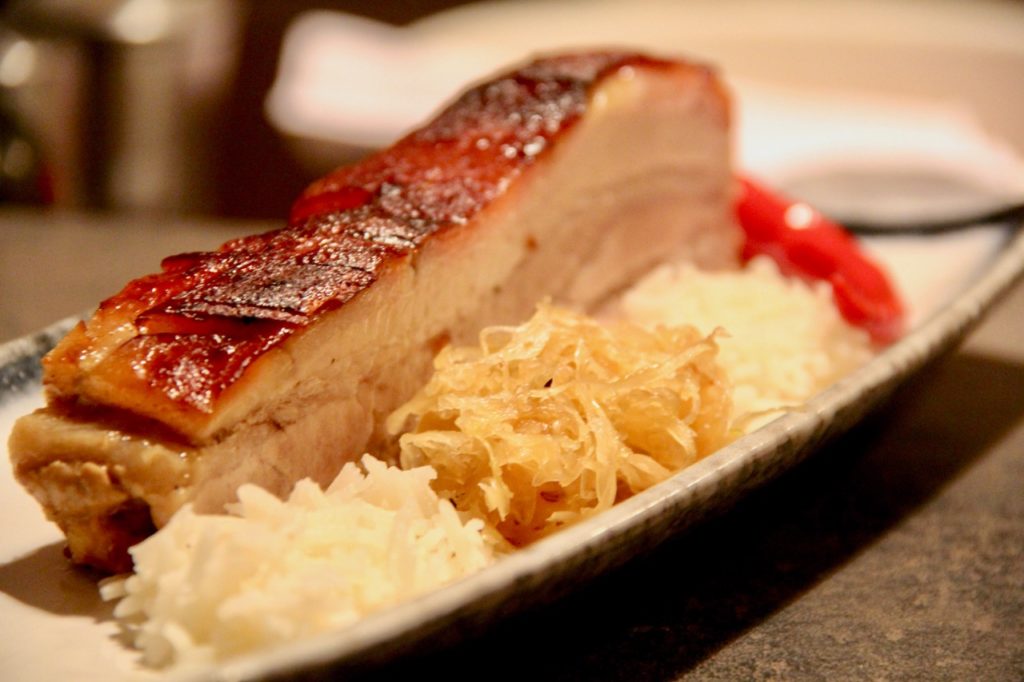 Zu den geschmorten Schweinsbackerln suchte ich einen Wein mit Struktur, der aber nicht zu mächtig ist – und wurde beim jugendlich-würzigen Eisenberg DAC 2015 (natürlich Blaufränkisch) fündig. Zu diesem rustikalen Gericht braucht es nicht den Top-Wein, wie etwa Saybritz, sondern einen animierenden Kompagnon mit feinem Gerbstoff und durchaus auch einer Portion Säure. Voraussetzungen, die dieser gute Tropfen, der übrigens von Minute zu Minute im Glas zugelegt hat, perfekt erfüllt. Genügend Kraft um der dichten Aromatik der Schweinsbackerln paroli bieten zu können aber auch kühle, erfrischende Würze und eben jene kleinen Widerhaken von Tannin und Säure, die für einen fröhlichen Trinkfluss sorgen. Kurzum: Ein charaktervoller, vom Terroir geprägter Wein, der unkompliziertes Trinkvergnügen auf hohem Niveau bietet.